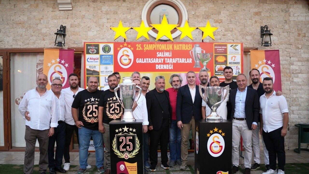 Galatasaray’ın 2024-2025 sezonu şampiyonluk kupası ve Ziraat Türkiye Kupası, Salihli Galatasaray Taraftarlar Derneği öncülüğünde düzenlenen organizasyonda Lidya Sardes Otel’de sergilendi. Organizasyonda sarı-kırmızılı taraftarlar, 25. şampiyonluk ve 5. yıldız coşkusunu doyasıya yaşarken, ayrıca çifte kupayla bol bol hatıra fotoğrafı çektirdi.