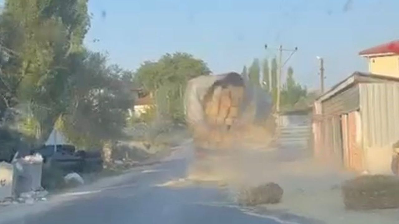 Denizli’nin Acıpayam ilçesinde saman yüklü kamyonun tehlikeli ilerleyişi kameralara yansıdı.