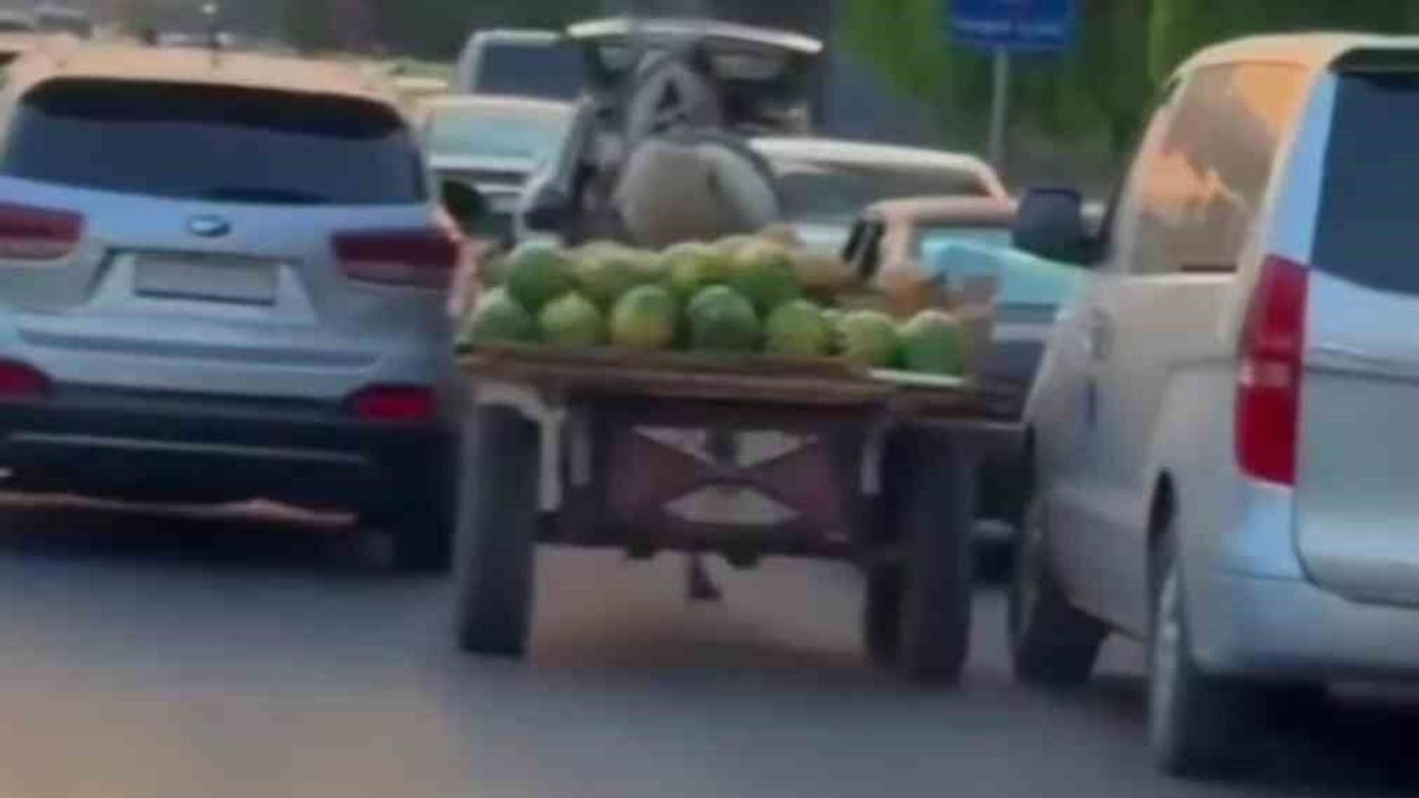 Suriye’nin başkenti Şam’da sürücüsü olmayan karpuz yüklü at arabası trafiği birbirine kattı.