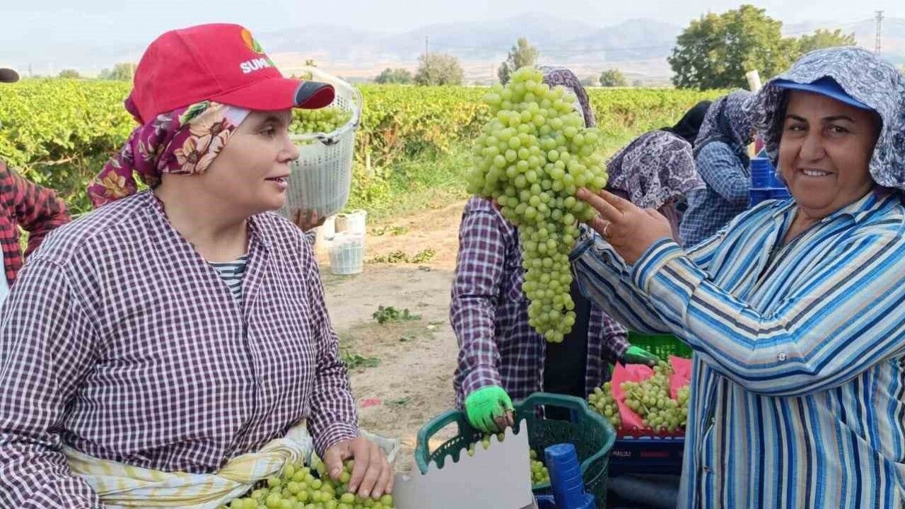 Bağdan kesilerek kasaya getirilen üzüm salkımı, ağırlığıyla adeta kasayı doldurdu. Kasaya yalnızca birkaç salkımla birlikte yerleştirilebilen üzüm, hasat işçilerini de ilgi odağı oldu.