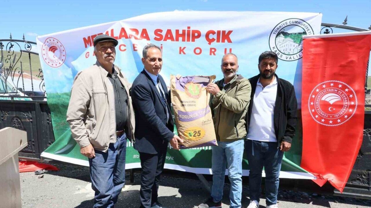 Kars Meralarını Geliştirme Projesi kapsamında, Sarıkamış ilçesine bağlı Yayıklı köyünde gerçekleştirilen programla yüzde 100 hibeli 60 ton korunga tohumu toprakla buluşturulmak üzere çiftçilere verildi.