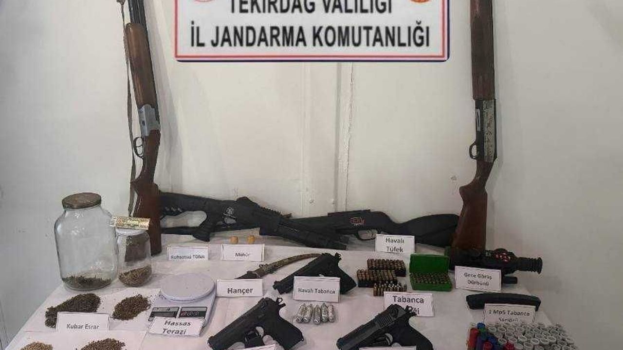 Tekirdağ'ın Şarköy ilçesinde jandarma ekiplerince bir adrese düzenlenen operasyonda uyuşturucu madde, çok sayıda silah, mühimmat ve kaçak içki ele geçirildi, 1 şüpheli tutuklandı.