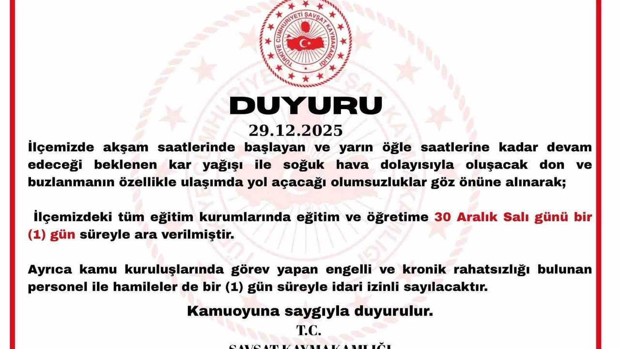 Şavşat Kaymakamlığı tarafından yapılan açıklamada, ilçede akşam saatlerinde başlaması ve yarın öğle saatlerine kadar devam etmesi beklenen kar yağışı ile soğuk hava şartlarının, özellikle ulaşımda olumsuzluklara yol açabileceği belirtildi. Bu kapsamda alınan tedbirler doğrultusunda, 30 Aralık Salı günü ilçedeki tüm eğitim kurumlarında eğitim ve öğretime bir gün süreyle ara verildiği duyuruldu.