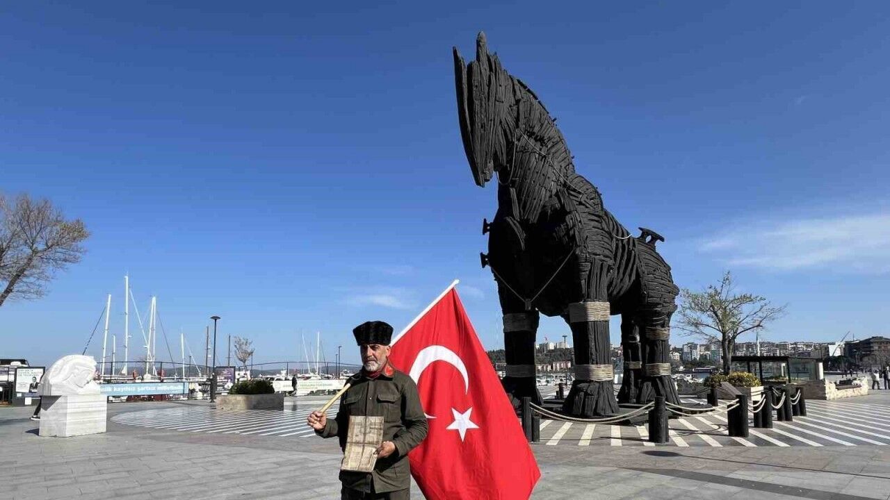 Çanakkale Deniz Zaferi’nin 110’uncu yıl dönümü kutlamalarına katılmak için İstanbul Avcılar’dan üzerinde askeri üniforma ve 2 metre uzunluğunda Türk bayrağıyla yürüyen Gazi torunu ve Tokat 15’liler Derneği Başkanı Saffet Gümüş (57), 375 kilometre yol kat ederek, 11 gün süren yolculuk sonunda Çanakkale’ye geldi.