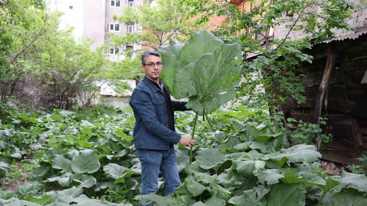 Oltu ilçesi Aslanpaşa Mahallesi’nde Şinasi Ekinci’ye ait bahçede yetişen kabalak otlarını görenler şaşırıyor. Yerden yüksekliği bir metreyi aşan yaprak genişliği adeta güneş şemsiyesi gibi olan kabalak otları Vietnam’ı andırıyor.