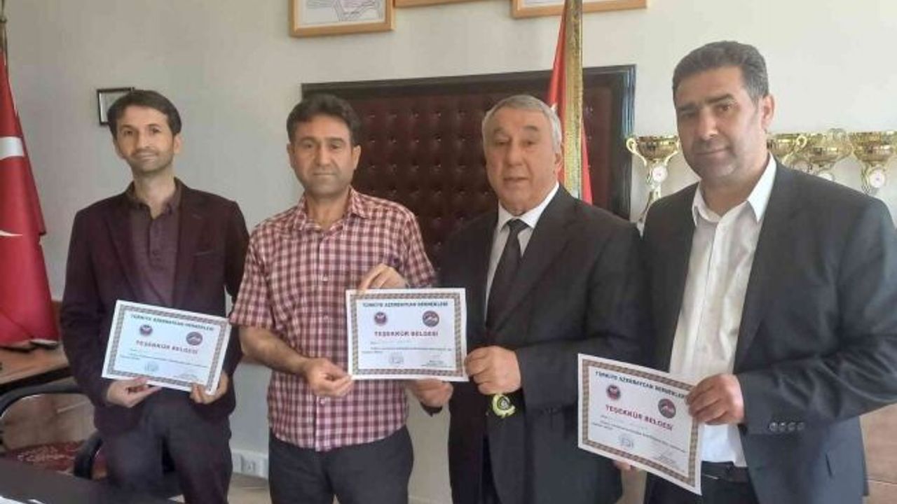 Türkiye Azerbaycan Dostluk Dernekleri federasyonu Genel Başkan yardımcısı ve Iğdır Azerbaycan Evi Derneği başkanı Serdar Ünsal, Türkiye Azerbaycan kardeşliğine destek olan öğretmen Rahim Aktaş, Ercan Aydemir ve Ayhan Bulut’a teşekkür belgesi verdi.