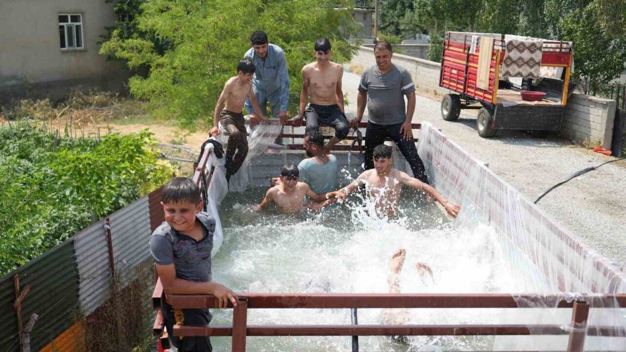 Muş’un Tabanlı köyünde yaşayan gençler, serinlemek için traktör römorkuna naylon serip su doldurarak yaptıkları havuzda keyifli dakikalar geçirdi.