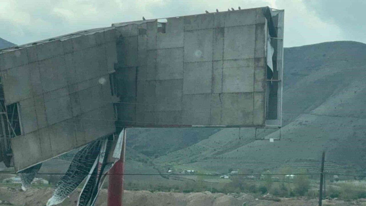 Meteorolojinin uyarısını yaptığı şiddetli rüzgar Elazığ’da etkili oldu. Bazı ilçelerde dolu yağışının da etkili olduğu kentte Kovancılar karayolu Çağlar mevkiinde bulunan dev reklam panosu da şiddetli rüzgardan nasibini aldı. Fırtına nedeni ile devrilen pano, kullanılamaz hale gelirken, bazı uyarı levhalarının da yerinden söküldüğü görüldü.