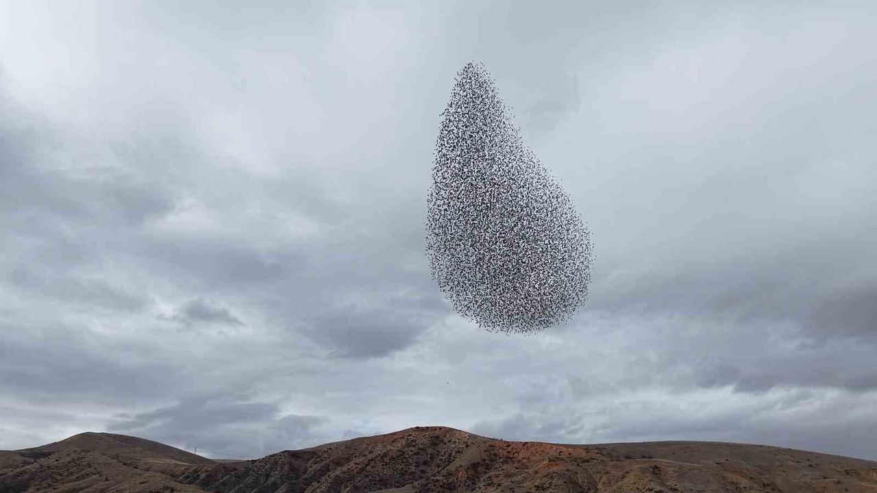 Kırıkkale'de sığırcık kuşlarının sürüler halinde gökyüzünde oluşturduğu şekiller ve ani dönüşlerle sergilediği hareketlilik, görsel şölen oluşturdu.