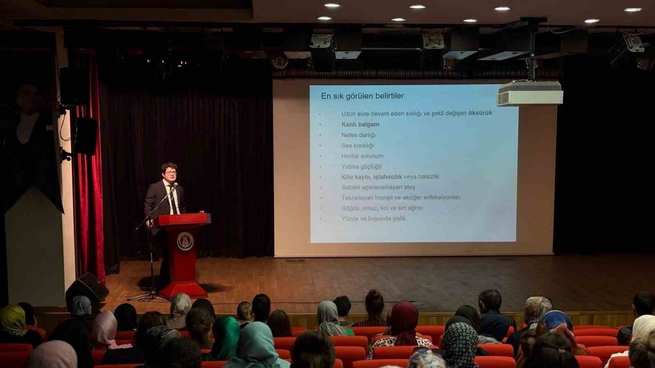 Farkındalık seminerinin ikinci bölümünde ise akciğer kanseri konusu ele alındı. Göğüs Hastalıkları Uzmanı Dr. Hüseyin Koşak, özellikle sigara kullanımının akciğer kanseri üzerindeki belirleyici rolünü hatırlatarak, hastalığın erken dönemde tespit edilmesinin tedavi başarısını önemli ölçüde artırdığını belirtti. Seminerde, akciğer kanserinin risk faktörleri, belirtileri ve güncel tedavi seçenekleri anlatıldı. Seminer sonunda erken tanının önemi ve sağlıklı yaşam alışkanlıklarının hastalıkların önlenmesindeki rolü bir kez daha vurgulandı.