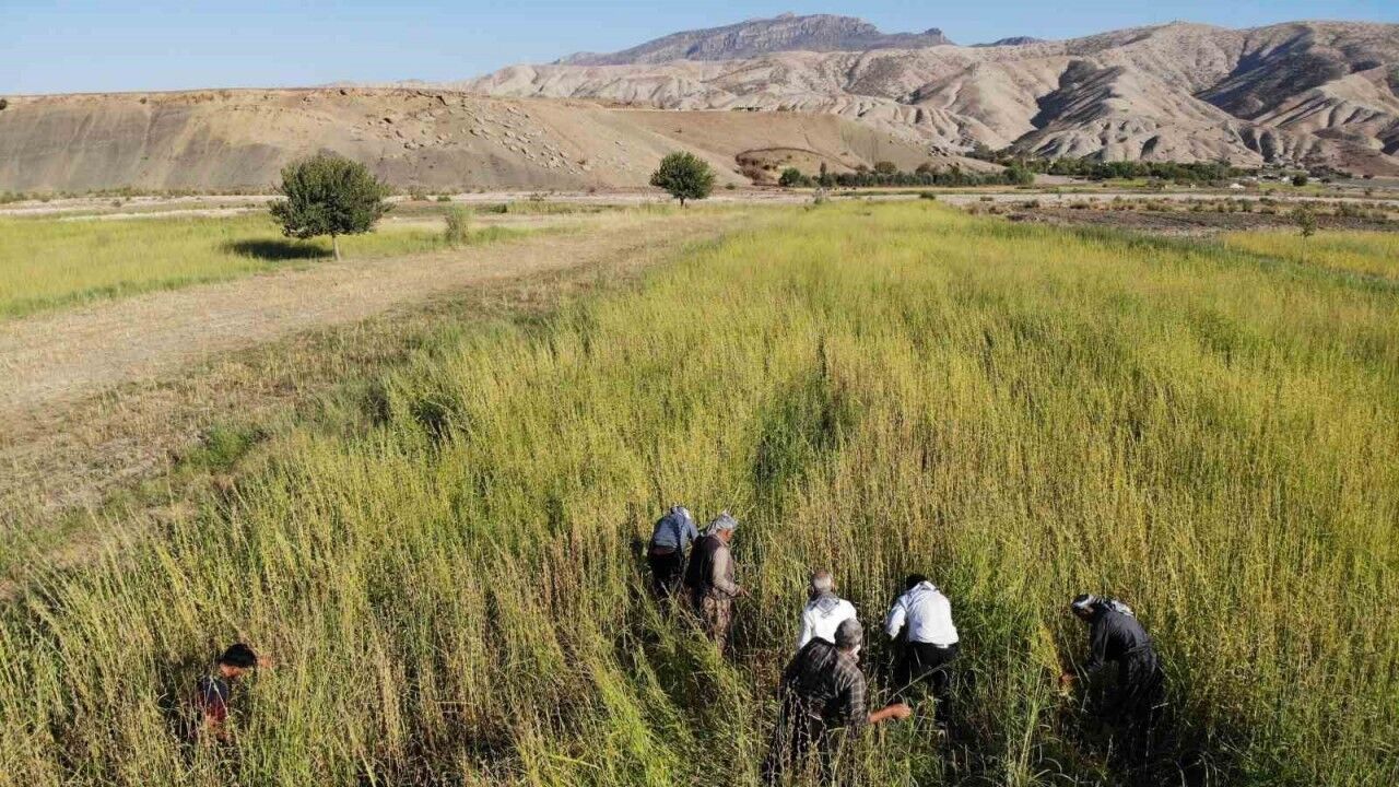 Mayıs-haziran döneminde ikinci ürün olarak ekimi yapılan susam, eylül-ekim aylarında imece usulüyle geleneksel yöntemlerle hasat ediliyor. Çiftçiler, aileleri ve komşularıyla orakla biçip demetledikleri susamları güneş altında yaklaşık 2 hafta kuruttuktan sonra dövme işlemine alıyor. Türk Patent ve Marka Kurumunca 2023 yılında coğrafi işaret ile tescillenen, tarihi su değirmenlerinde hazırlanan Dergul (Kumçatı) tahinine rağbet artınca yöredeki çiftçiler, bu yıl 5 bin dekar alanda ikinci ürün olarak susam ekimine ağırlık verdi. Kumçatı beldesi ve civar köylerinde Gabar ve Cudi Dağı eteklerindeki arazilerde üreticilerin oraklarla imece usulü ile yaptığı susam hasadına Tarım ve Orman İl Müdürü Oktay Sezgin de eşlik etti. Sezgin, İHA muhabirine yaptığı açıklamada bu yıl 5 bin dekar alan üzerinde ikinci ürün olarak ekimi gerçekleştirilen susam hasadından 300 ton rekolte beklediklerini ifade etti. Sezgin, "Kumçatı bölgesindeki çiftçilerimiz bu yıl susam hasadına başladı. Mayıs-haziran döneminde ikinci ürün olarak bölgemizde ekilişi gerçekleşen susamın eylül-ekim döneminde hasadı yapılmaktadır. Burada hasat işlemi geleneksel usulle devam etmektedir. Bölgemizdeki çiftçilerimiz, aile üyeleri, komşularıyla imece usulüyle arazilere girerek susamlarını hasat etmektedir. Bugün görmüş olduğunuz arazide gün batımına kadar yaklaşık 20 dekarlık arazide susam hasadını hep beraber gerçekleştireceğiz. 2024 yılında Şırnak ili Kumçatı bölgesinde, lokal bir bölgedir burası, 2 bin 500 dekar susam tarımı gerçekleşti. Bu tarımda yaklaşık 175 ton susam elde ettik. Bununla beraber o bölgede ticarete konu oldu. Şırnak Dergul tahini olarak coğrafi işaret alan tahinimizin ham maddesi bölgede üretilmektedir. Susam, bu bölgede yetişmekte, bu bölgede su değirmenlerinde öğütülerek tahin haline gelmektedir. Coğrafi işareti almasıyla beraber hem bölgemizde hem de ülkemizde Şırnak Dergul tahini tüketimi artmıştır. Bu artışa bağlı olarak da 2025 yılında ekiliş alanımız 5 bin dekara ulaşmış, bu yıl da 300 tonun üzerinde bir rekolte elde etmeyi hedeflemekteyiz" dedi.