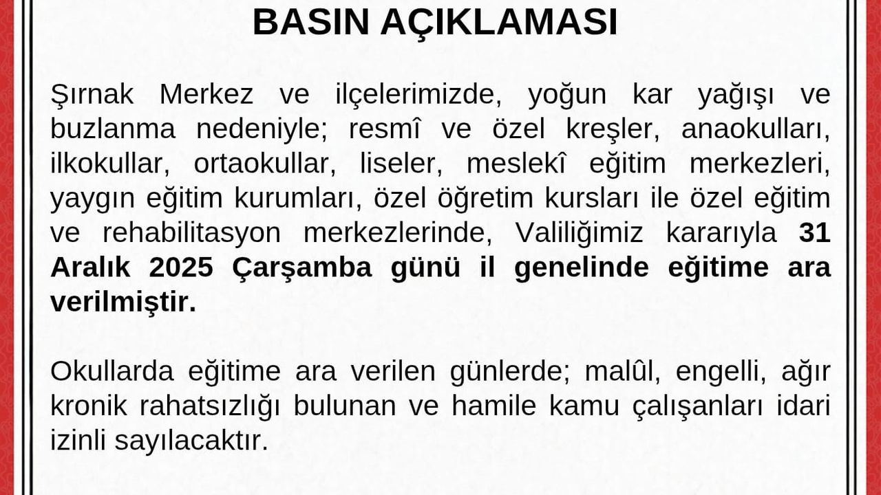 Şırnak Valiliğinden yapılan açıklamada, ''Şırnak merkez ve ilçelerimizde, yoğun kar yağışı ve buzlanma nedeniyle resmi ve özel kreşler, anaokulları, ilkokullar, ortaokullar, liseler, meslekî eğitim merkezleri, yaygın eğitim kurumları, özel öğretim kursları ile özel eğitim ve rehabilitasyon merkezlerinde, valiliğimiz kararıyla 31 Aralık 2025 Çarşamba günü il genelinde eğitime ara verilmiştir. Okullarda eğitime ara verilen günlerde malul, engelli, ağır kronik rahatsızlığı bulunan ve hamile kamu çalışanları idari izinli sayılacaktır'' denildi.