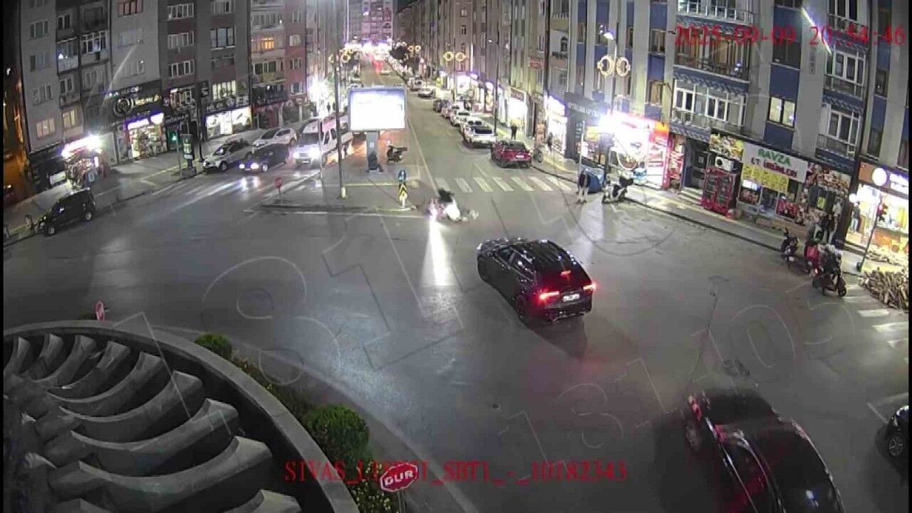 İlk kaza, Sivas Lisesi Kavşağı’nda meydana geldi. Görüntülerde bir otomobilin kavşağa çıktığı ve bu sırada kavşaktan geçmekte olan motosikletle çarpıştığı görüldü. Çarpışmanın etkisiyle motosiklette bulunan iki kişi yere savruldu.
