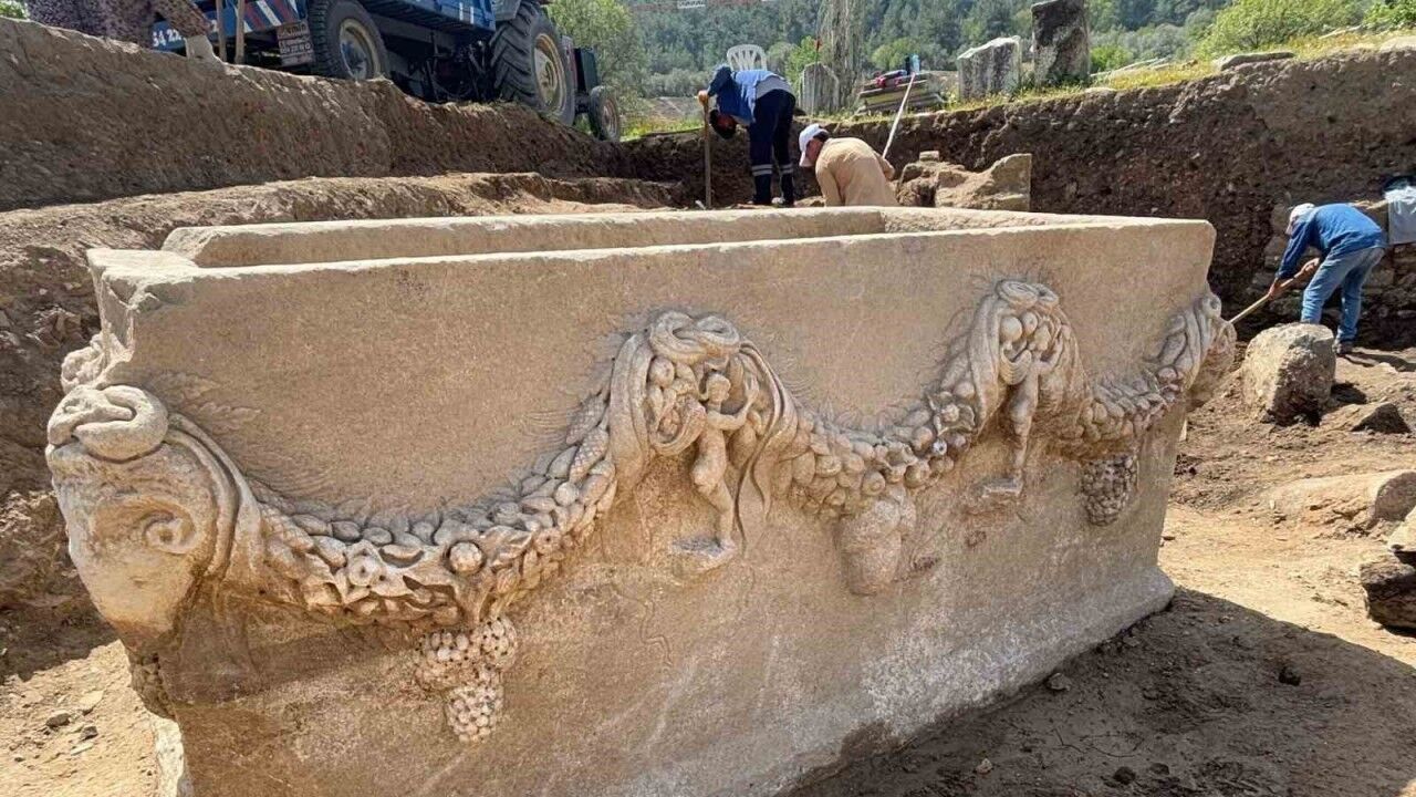 Pamukkale Üniversitesi (PAÜ) İnsan ve Toplum Bilimleri Fakültesi (İTBF) Arkeoloji Bölümü öğretim üyesi Prof. Dr. Bilal Söğüt Başkanlığında yürütülen arkeolojik kazı ve restorasyon çalışmaları kapsamında Stratonikeia Antik Kenti’nde girlandlı (meyve, çiçek ve yapraklardan oluşan çelenk), 2 bin yıllık bir lahit mezar bulundu.