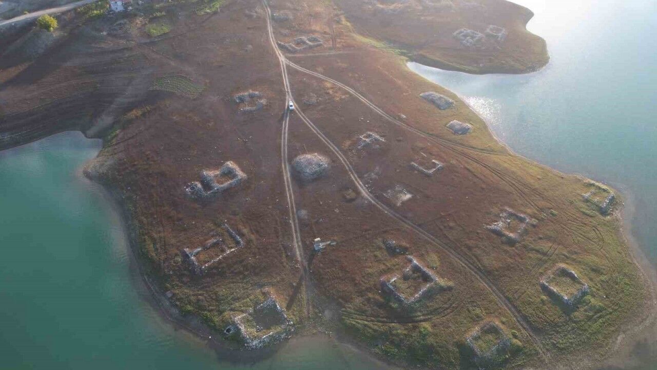 Kahramanmaraş’ın Onikişubat ilçesindeki Menzelet Barajı altında kalan eski yerleşim yeri, suyun çekilmesiyle ortaya çıktı.