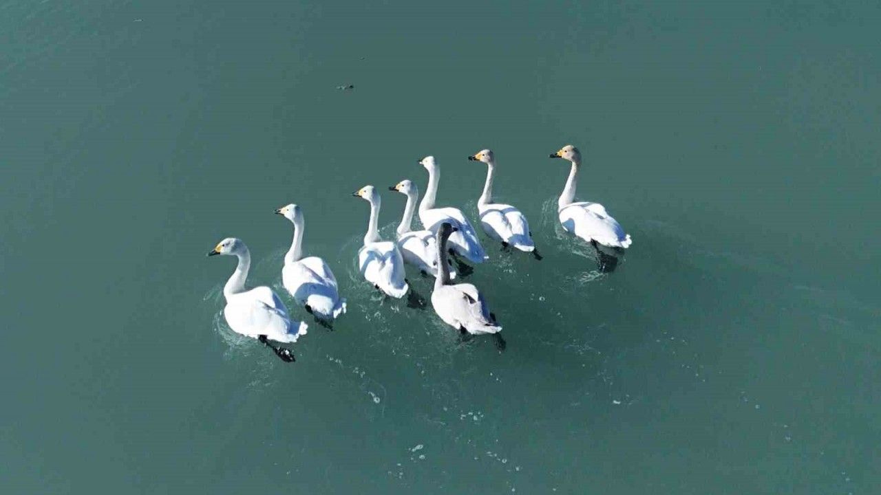 Yaz aylarında gölü pembe tonlara bürüyen flamingoların göç etmesiyle bölgede hâkimiyet beyaz renkli ötücü kuğulara geçti. Yaklaşık 200 farklı kuş türüne ev sahipliği yapan Arin Gölü, havaların soğumasıyla birlikte önemli bir göç durağı olarak yeniden canlandı. Bu dönemde göle gelen ötücü kuğular, sakin ve etkileyici duruşlarıyla izleyenleri adeta büyülerken, dronla çekilen görüntüler doğanın sunduğu eşsiz güzelliği gözler önüne serdi. Havadan kaydedilen görüntülerde, Arin Gölü’nün berrak yüzeyinde süzülen kuğuların arka planında yükselen, zirvesi karla kaplı Süphan Dağı dikkat çekti. Kuğular ile dağın görkemi aynı karede buluşunca ortaya kartpostallık manzaralar çıktı.