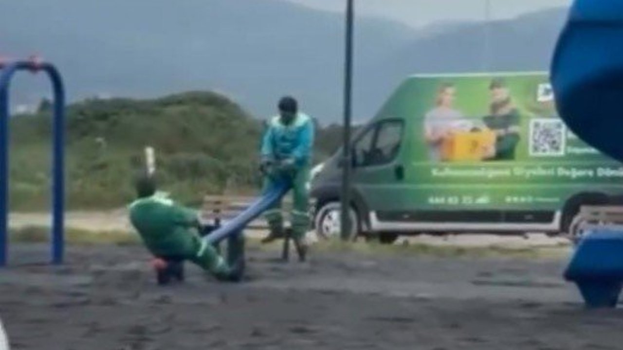 Bursa'da görev yapan belediye temizlik işçilerinin iş arası verdikleri kısa molada tahterevalliye binerek sergiledikleri samimi görüntüler gündem oldu.