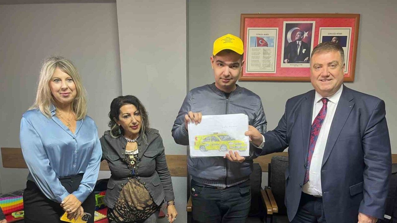 Bayraklı’da faaliyet gösteren bir özel eğitim ve rehabilitasyon merkezinde eğitim alan 19 yaşındaki Halil Aziz Kama, taksilere duyduğu özel ilgiyle çizdiği resimleri, İzmir Şoförler ve Otomobilciler Esnaf Odası Başkanı Erkan Özkan’a gönderdi. Merkez kurucusu ve öğretmeni Kamile Çubuk’un mektubuyla birlikte Odaya ulaşan bu anlamlı çalışma, duygu dolu bir ziyaretin kapılarını araladı. Başkan Özkan, 3 Aralık Dünya Engelliler Günü vesilesiyle Halil’i okulunda ziyaret ederek özel hediyeler takdim etti. Başkan Özkan, Kama’ya fanatik taraftarı olduğu Beşiktaş’ın lisanslı ürünleri ve formasının yanı sıra maket taksi, yapacağı resimler için resim kağıdı ve boyalar ile kalemler hediye etti. Ziyarette duygu dolu anlar yaşandı.
