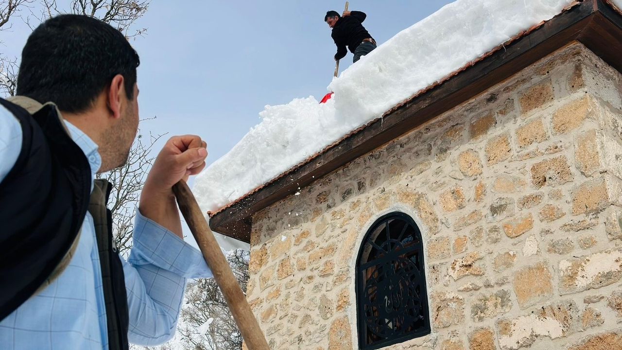 Hakkari'nin Şemdinli ilçesinde etkili olan yoğun kar yağışının ardından Bağlar köyündeki tarihi türbelerin çatısında biriken kar kütleleri, köy muhtarı ve imamı tarafından temizlendi.