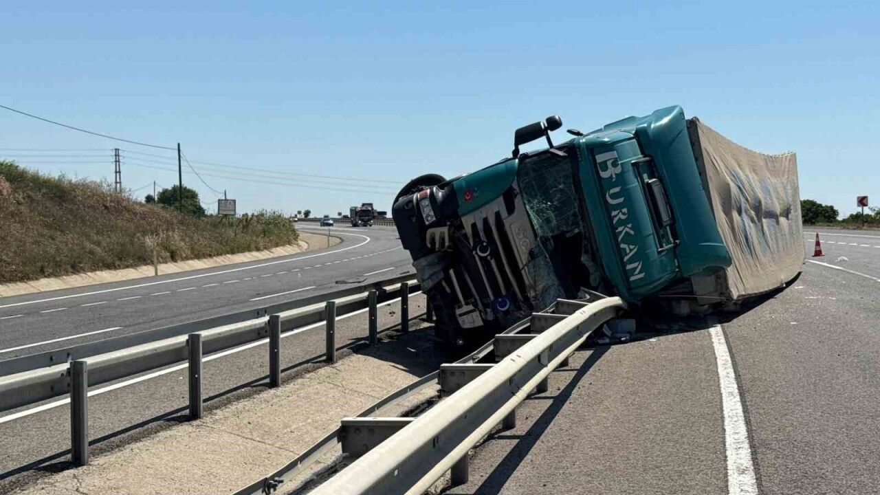Tekirdağ’ın Malkara yolu üzerinde devrilen tırdan refüje savrulan sürücü yaralandı.