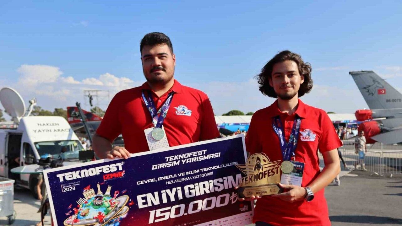 Sergilenen ürünlerle milli teknolojide gelinen noktayı sergileyen ve Türk Yıldızları, Solo Türk, Akıncı, HÜRKUŞ ve ANKA’nın uçuşlarıyla renklenen, yarışmalarla, etkinliklerle unutulmaz bir deneyim yaşatan TEKNOFEST İzmir’de ödül töreni düzenlendi. Projeleri ile dereceye giren gençler, ödüllerini Cumhurbaşkanı Recep Tayyip Erdoğan’ın elinden aldı. Festivalin Çevre, Enerji ve İklim Teknolojileri Hızlandırma Kategorisi dalında ’En İyi Girişim’ ödülü Yıldız Teknik Üniversitesi Elektrik Mühendisliği mezunu Güven Çömezoğlu ve aynı okul ve bölümün son sınıf öğrencisi Kerem Kamiloğlu’nun oldu. 150 bin liralık para ödülünün sahibi olan ikili, projelerinden bahsederken yaşadıkları mutluluğu da dile getirdi.