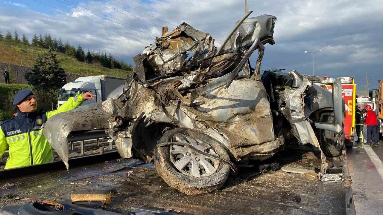 Çarpışmanın şiddetiyle 34 HG 9019 plakalı tırın dorsesi devrildi, yüklü mıcırlar yola savruldu. Devrilen dorsenin altında kalan otomobilde bulunan sürücü İzzet Kaysi (78) ile eşi Mesude Kaysi (73) araç içinde sıkıştı.