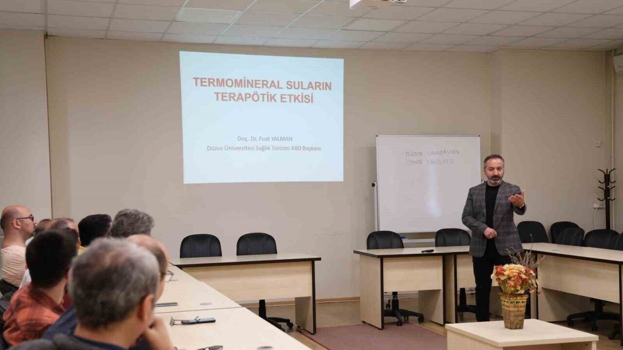 Etkinliğe davetli konuşmacı olarak katılan Düzce Üniversitesi İşletme Fakültesi Sağlık Yönetimi Bölümü Öğretim Üyesi Doç. Dr. Fuat Yalman, termomineral suların tedavi edici etkilerine dair kapsamlı bir sunum yaptı. Termal ve termomineral sular arasındaki farkları anlatan Yalman, bu suların uygulama yöntemleri ve etki mekanizmalarını detaylandırdı. Termal suların, kaldırma kuvveti, viskozite, termik ve kimyasal etkiler, penetrasyon ve flüsyon gibi etki mekanizmaları olduğunu söyleyen Yalman, termomineral suların kimyasal özelliklerine de değindi.