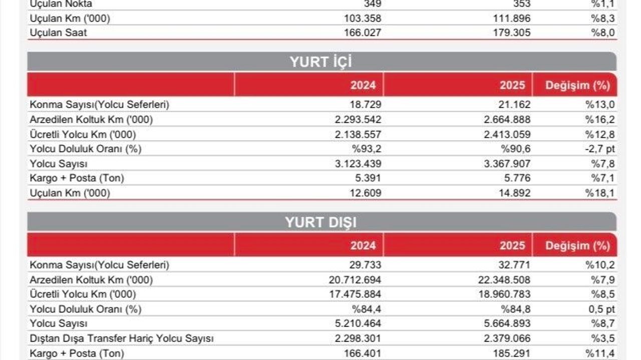 Şirketin geçen yıl Temmuz ayında 8,3 milyon olan toplam yolcu sayısı, bu yıl aynı dönemde yüzde 8,4 artışla 9 milyona ulaştı. Dıştan dışa transfer yolcu sayısı ise Temmuz 2025’te, geçen yılın aynı ayına göre yüzde 12,8 artarak 3,3 milyon olarak kayıtlara geçti. Yolcu doluluk oranı Temmuz ayında 0,2 puanlık artışla yüzde 85,4’e yükselirken; yurt dışı uçuşlarda doluluk oranı yüzde 84,8, yurt içi uçuşlarda ise yüzde 90,6 olarak gerçekleşti. Geçen yıl Temmuz ayında 23 milyar olan toplam arz edilen koltuk kilometresi (AKK), bu yılın aynı döneminde yüzde 8,7 artarak 25 milyara çıktı. Aynı dönemde taşınan kargo ve posta miktarı ise yüzde 11,2 artış göstererek 191,1 bin ton seviyesine ulaştı.