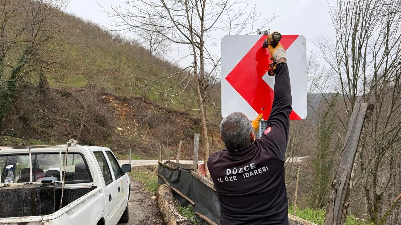 DÜZCE (İHA) - Çilimli ve Akçakoca ilçelerinde trafik güvenliğini artırmak amacıyla, grup yolu üzerinde levha yerleştirme çalışmaları sürüyor. Yetkililer, sürücülerden yeni levhalara dikkat etmelerini ve güvenli sürüş sağlamalarını istedi.