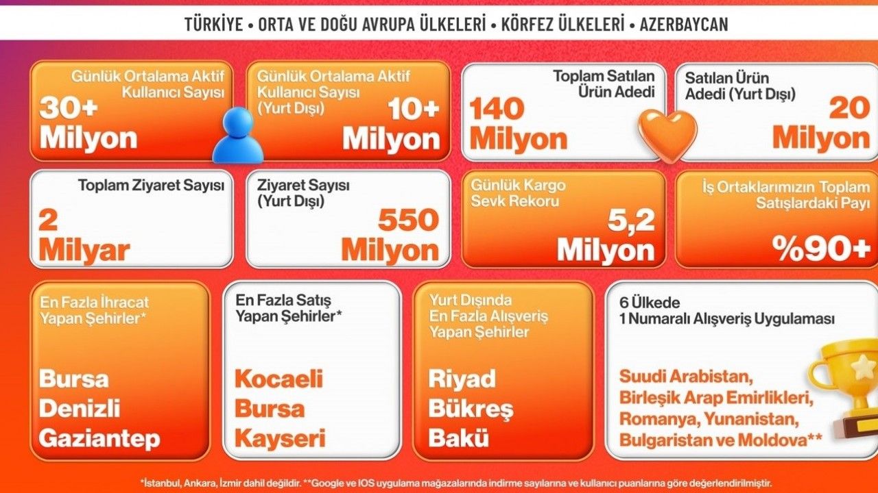 Açıklamaya göre, e-ticaret platformu, uygulama performansında da Kasım ayında uluslararası pazarlarda öne çıktı. Platform, Suudi Arabistan, Birleşik Arap Emirlikleri, Romanya, Yunanistan, Bulgaristan ve Moldova’da mobil uygulama mağazalarının alışveriş kategorilerinde 1 numaraya yerleşti. E-ticaret platformu, lojistik operasyonlarında da Kasım döneminde faaliyet gösterdiği tüm pazarlarda günlük 5,2 milyon kargo sevkiyatına ulaşarak yeni bir gönderim rekoru kırdı.
