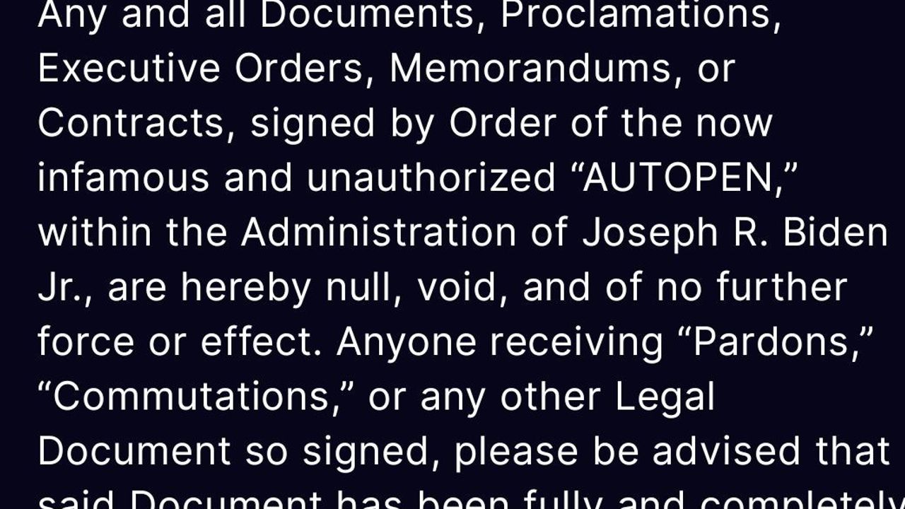 Bu nedenle o dönemde imzalanan tüm resmi belgeleri geçersiz kıldığını söyleyen Trump, "Sahtekar Joe Biden tarafından doğrudan imzalanmamış tüm başkanlık kararnamelerini ve resmi belgeleri iptal ediyorum. Çünkü ‘Autopen’i kullanan kişiler bunu yasadışı bir şekilde yapmıştır" demişti. Biden’ın resmi başkanlık belgelerinin "Autopen" ile imzalandığı sürece dahil olmadığının altını çizen Trump, "Eğer dahil olduğunu söylerse, yalancı şahitlik suçlamasıyla karşı karşıya kalacaktır" uyarısında bulunmuştu.