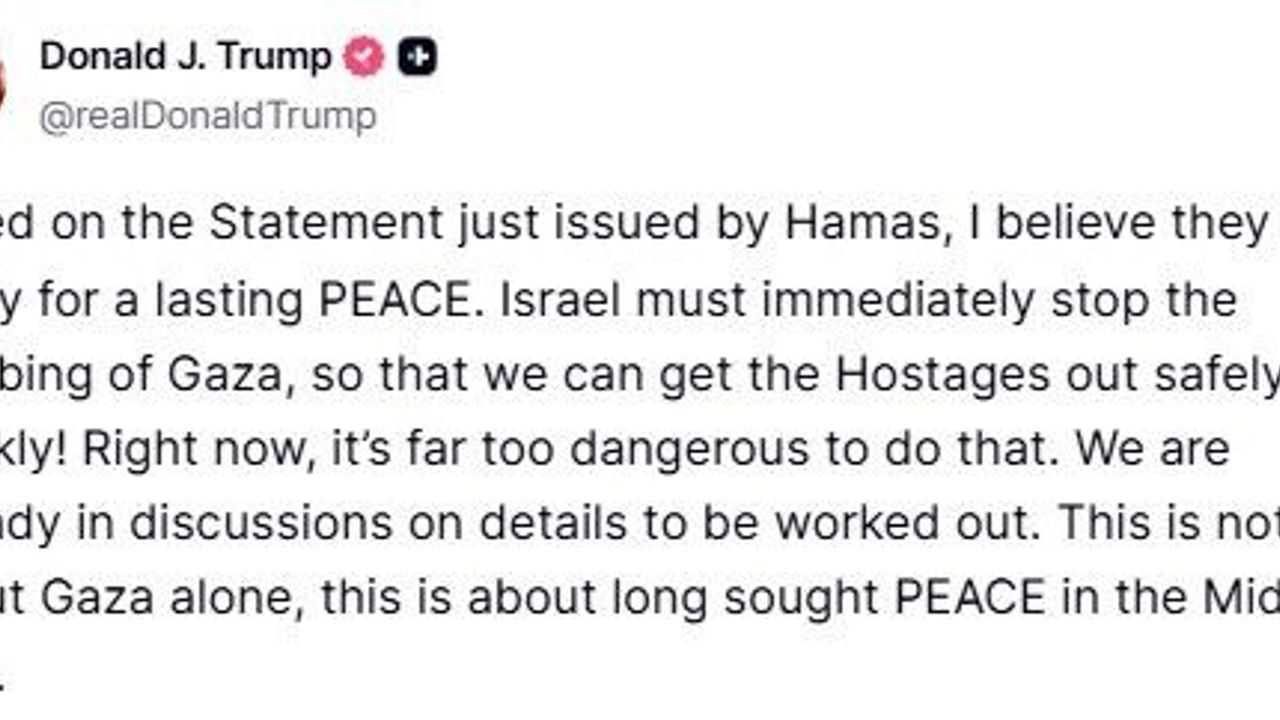 ABD Başkanı Donald Trump, Hamas’ın kalıcı bir barışa hazır olduğuna inandığını belirterek, "İsrail, Gazze’yi bombalamayı derhal durdurmalı ki; rehineleri güvenli ve hızlı bir şekilde bölgeden çıkarabilelim! Ortam, şu anda bunu yapmak için çok tehlikeli" açıklamasında bulundu.