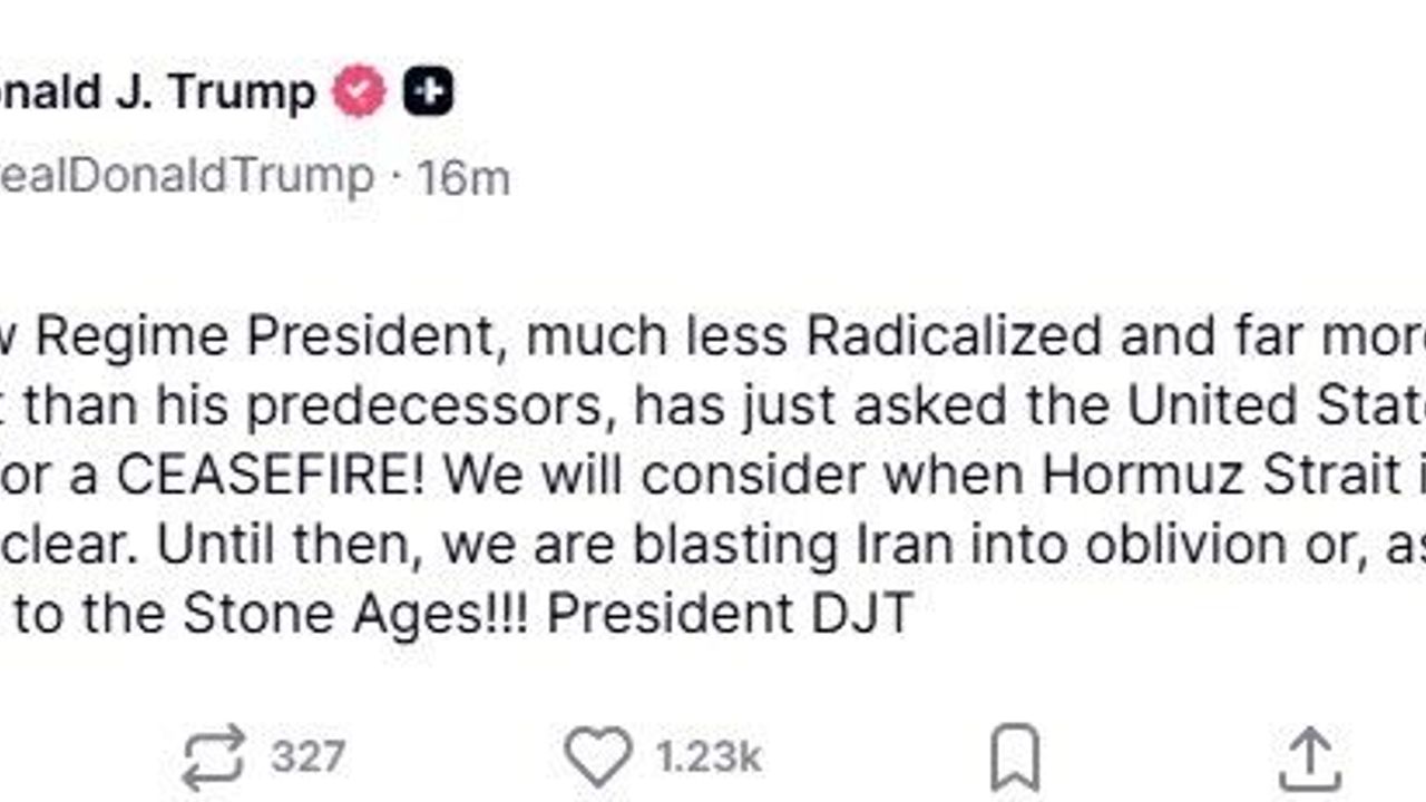 ABD Başkanı Donald Trump, Trurth Social platformundan İran'a ilişkin paylaşım yaptı. Trump paylaşımda, 'İran'da yeni rejimin lideri, öncekilerden çok daha az radikalleşmiş ve çok daha zeki bir kişi olarak, ABD'den ateşkes talep etti. Hürmüz Boğazı ne zaman açık, serbest ve güvenli hale gelirse bunu o zaman değerlendireceğiz. O zamana kadar İran'ı yerle bir edeceğiz ya da deyim yerindeyse taş devrine döndüreceğiz' ifadelerini kullandı.