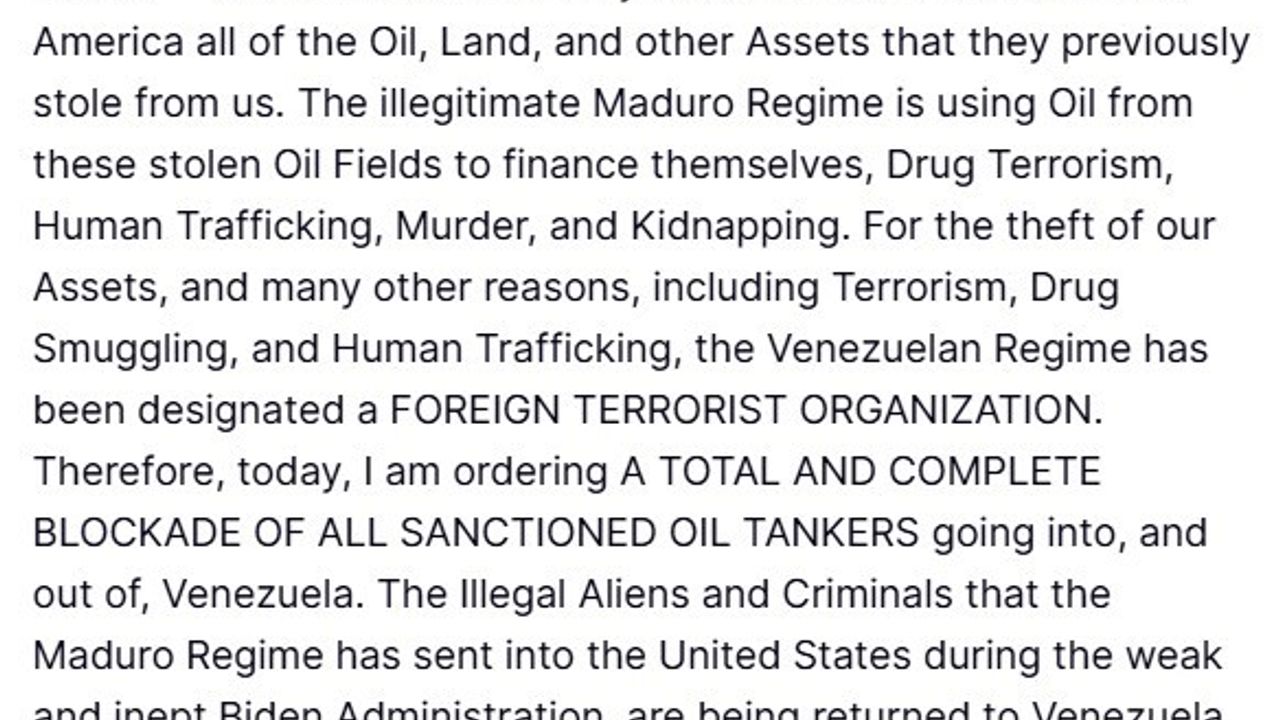 Nicolas Maduro rejiminin "gayrimeşru" olduğunu ve çalınmış petrol sahalarından elde edilen petrolü uyuşturucu terörizmi, insan kaçakçılığı, cinayet ve adam kaçırma faaliyetlerini desteklemek için kullandığını savunan Trump, "Varlıklarımızın çalınması başta olmak üzere, terörizm, uyuşturucu kaçakçılığı ve insan ticareti gibi pek çok gerekçe nedeniyle Venezuela rejimi, ‘Yabancı Terör Örgütü’ olarak tanımlanmıştır. Bu nedenle bugün, Venezuela’ya giren ve Venezuela’dan çıkan tüm yaptırıma tabi petrol tankerlerine tam ve kapsamlı bir abluka emri veriyorum" açıklamasında bulundu.