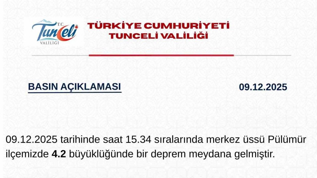 Tunceli Valiliği’nden yapılan açıklamada, "09.12.2025 tarihinde saat 15.34 sıralarında merkez üssü Pülümür İlçemizde 4.2 büyüklüğünde bir deprem meydana gelmiştir. Meydana gelen depremin ardından ilgili birimlerimiz tarafından yapılan saha taramalarında, şuana kadar can ve mal kaybına yönelik olumsuz bir durum bulunmamakta olup saha taramalarına devam edilmektedir. Ayrıca vatandaşlarımız tarafından da ilgili kurumlarımıza şu ana kadar herhangi bir olumsuzluk bildirilmemiştir. Tüm vatandaşlarımıza geçmiş olsun dileklerimizi iletiyoruz. 112 Acil çağrı merkezimiz 7/24 halkımızın hizmetindedir" denildi.