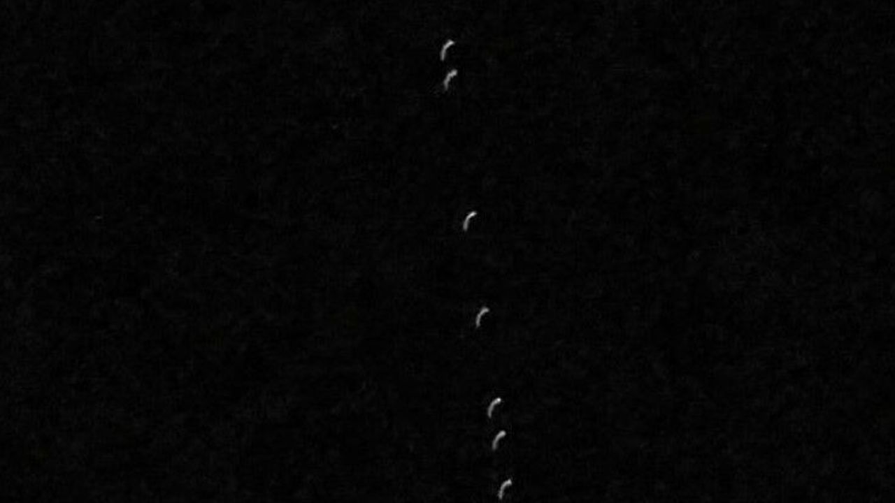 Tunceli’de dün gece gökyüzünde sıralı halde giden Starlink uyduları, Hasan Turan isimli vatandaş tarafından cep telefonuyla fotoğraflandı.