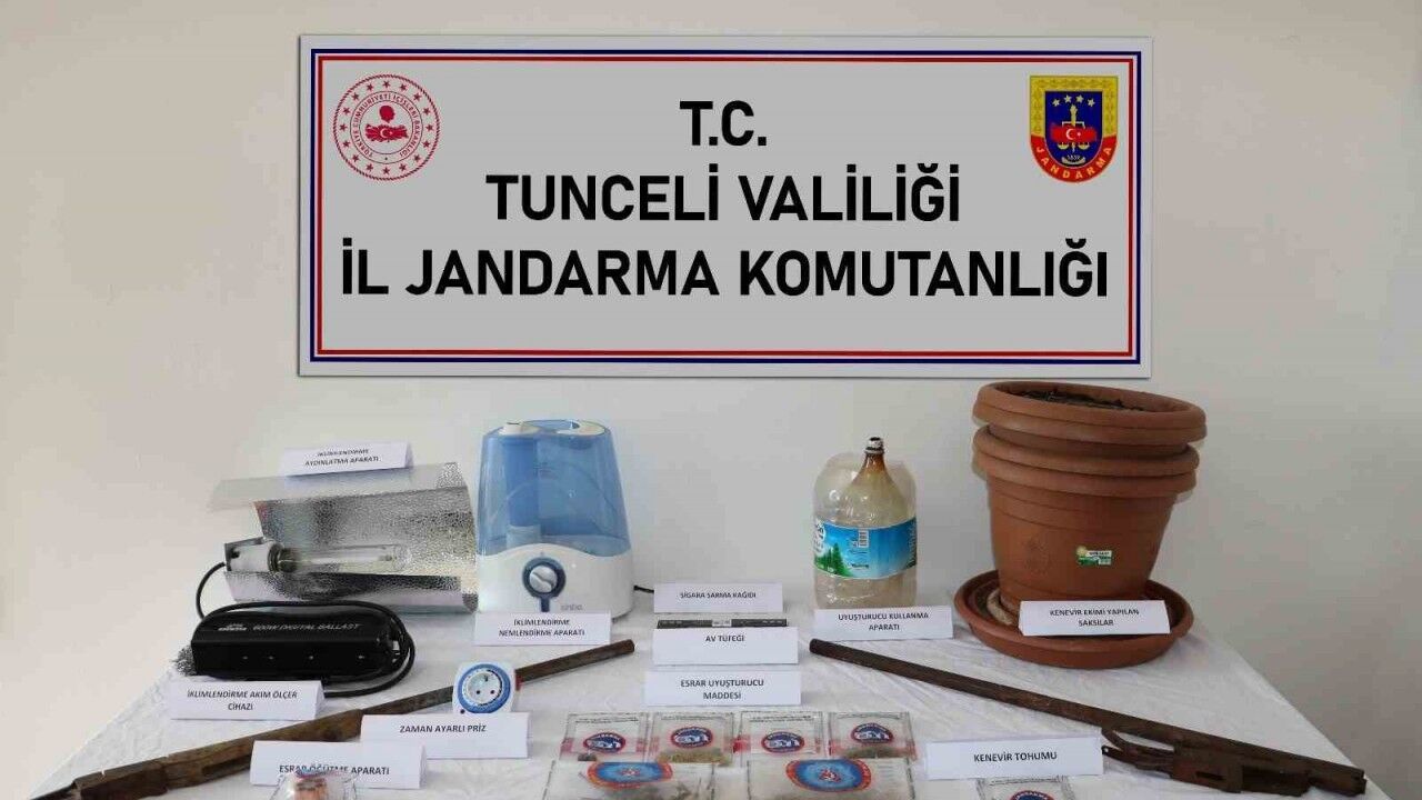 Tunceli İl Jandarma Komutanlığı KOM ve Asayiş birimleri tarafından Mazgirt ilçemiz Dallıbel köyünde uyuşturucu madde imal ve ticareti yaptığı tespit edilen İ.G.’nin ikametine operasyon düzenledi. Şüphelinin ev ve eklentilerinde; 50 kök kenevir bitkisi, 176 gram satışa ve kullanıma hazır kubar esrar, suçtan ele edilen 5 bin 900 Euro, 1 adet uyuşturucu üretiminde kullanılan filizlendirme/iklimlendirme aparatı, 1 adet ruhsatsız av tüfeği, 1 adet cep telefonu, 1 adet kaçak avlanan kaya kartalı trofesi, 1 adet kaçak avlanan dağ keçisi boynuzu, 300 metre sulama hortumu ve 1 adet bong olarak tabir edilen uyuşturucu kullanım aparatı ele geçirildi.
