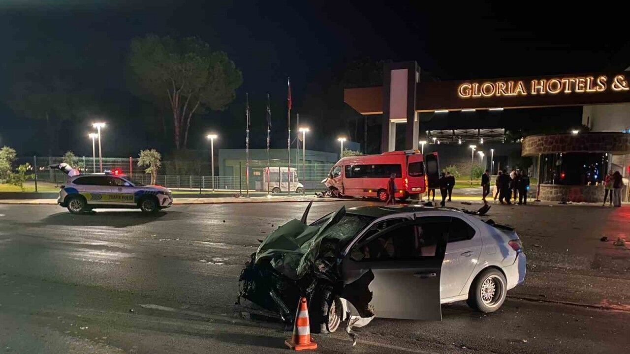 Kaza, dün saat 23.00 sıralarında Belek Mahallesi Turizm Caddesi üzerinde meydana geldi. Edinilen bilgiye göre, İsmail A. idaresindeki 46 AKS 092 plakalı tur minibüsü ile Ahmet G. yönetimindeki 07 AGC 494 plakalı otomobil çarpıştı. Çarpışmanın etkisiyle minibüs, yol kenarında bulunan 5 yıldızlı bir otelin tel çitlerine çarparak durabildi. Kazada otomobil sürücüsü Ahmet G. ile yanında yolcu olarak bulunan Sevcan Ö. (37) yaralandı. Olay yerine polis ve sağlık ekipleri sevk edildi. Yaralılar, sağlık ekiplerinin ilk müdahalesinin ardından ambulanslarla Serik’teki hastanelere kaldırıldı. Yaralılardan Sevcan Ö.’nün durumunun ağır olduğu öğrenildi. Tur minibüsünün Antalya Havalimanı’ndan aldığı 6 Rus turisti Boğazkent Mahallesi’ndeki bir otele götürdüğü, turistlerin kazayı yara almadan atlattığı bildirildi. Turistler, olay yerine gelen başka bir araçla otellerine gönderildi. Polis ekipleri, kazayla ilgili inceleme başlattı.
