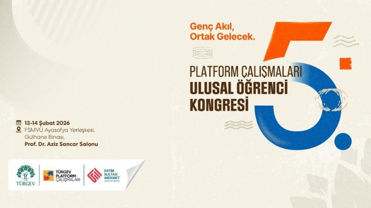 Türkiye Gençlik ve Eğitime Hizmet Vakfı (TÜRGEV) tarafından yürütülen Platform Çalışmaları kapsamında düzenlenen 5. Ulusal Öğrenci Kongresi, 13-14 Şubat tarihlerinde İstanbul'da gerçekleştirilecek. Genç araştırmacıların akademik üretimlerini disiplinlerarası bir zeminde paylaşmalarına imkan sunan kongre, Fatih Sultan Mehmet Vakıf Üniversitesi Ayasofya Yerleşkesi Gülhane Binası Prof. Dr. Aziz Sancar Salonu'nda iki gün sürecek.