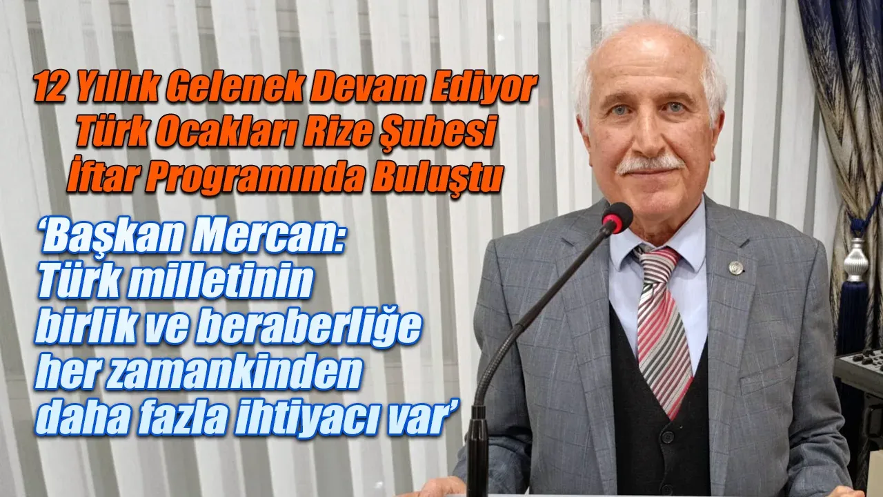 Türk Ocakları Rize Şubesi Başkanı Turan Aslan Mercan, yaptığı konuşmada 2013 yılından bu yana düzenlenen iftar programlarının bu yıl 12’ncisinde bir araya gelmenin mutluluğunu yaşadıklarını belirtti. İftar organizasyonunun hayırseverlerin ve üyelerin katkılarıyla gerçekleştirildiğini ifade eden Mercan, destek veren herkese teşekkür etti.