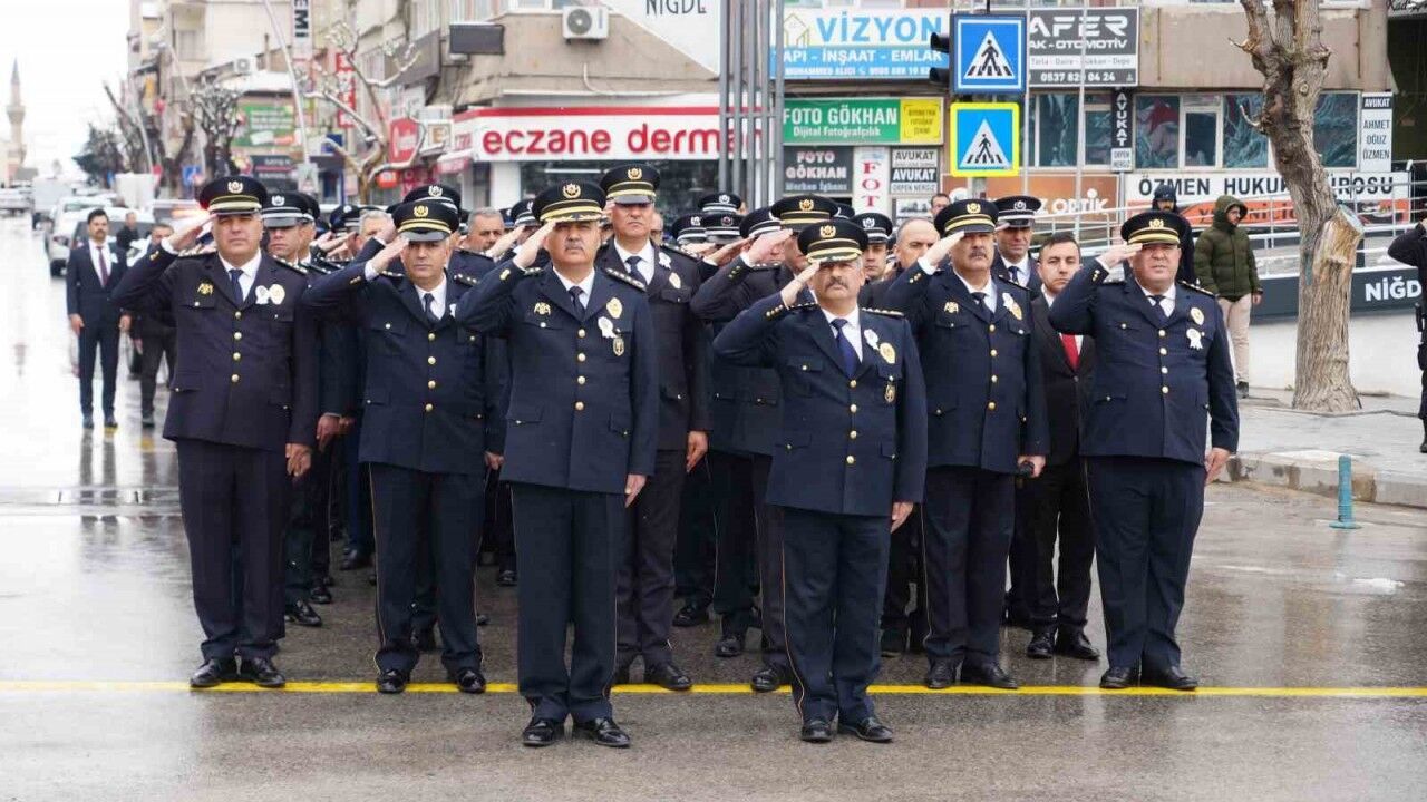 Cumhuriyet Meydanı’ndaki törende İl Emniyet Müdürü Yılmaz Delen ve Niğde Polis Meslek Eğitim Merkezi Müdürü Mehmet Kemal Arısoy, Atatürk Anıtı’na çelenk sundu. Çelenk sunumun ardından saygı duruşunda bulunuldu, İstiklal Marşı okundu. Cumhuriyet Meydanı’ndaki törenin ardından Şehit Ömer Halisdemir Meydanı’nda açılan emniyet teşkilatında bugüne kadar kullanılan eşyaların sergisi ziyaret edildi.