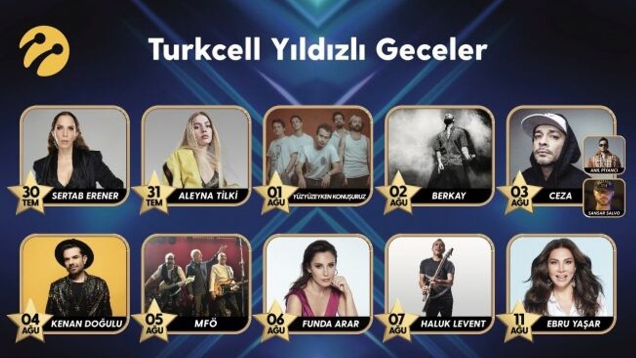 Turkcell, müziğin gelişimine katkı amacıyla düzenlediği geleneksel Turkcell Yıldızlı Geceler konserleriyle bu yıl da sanatseverleri Türkiye’nin önde gelen sanatçılarıyla buluşturuyor. 30 Temmuz-11 Ağustos tarihleri arasında, Vadistanbul, SM Production ve Atlantis Yapım iş birliğiyle açıkhava sahnesi Turkcell Vadi Açıkhava’da, pandemi şartlarına uygun şekilde gerçekleştirilecek olan etkinlik serisi 30 Temmuz’da Sertab Erener konseriyle başlayacak. Şirketin gençlere özel operatör bağımsız kullanılabilen uygulaması GNÇ kullanıcıları, Yıldızlı Geceler konserlerinin biletlerini yüzde 20, Turkcell Platinum üyeleri ise yüzde 25 indirimli satın alma imkanına sahip olacağı belirtildi.