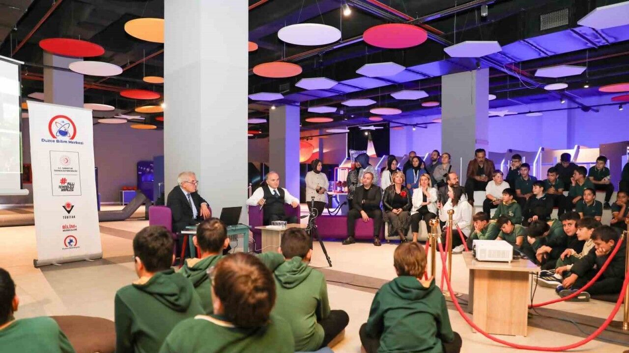 İstanbul Üniversitesi Fen Fakültesi Astronomi ve Uzay Bilimleri Bölümü Genel Astronomi Ana Bilim Dalı Öğretim Üyesi Prof. Dr. Ahmet Talat Saygaç’ın "Uzay Meslekleri" sunumu ile başlayan konferansa katılan Özlü, çocukların merak ettiği sorulara yanıt verirken Düzce Bilim Merkezi inşa sürecini anlattı. Başkan Özlü, "Düzce’de bilimi sevdirmek, çocuklarımızı ve gençlerimizi bilimsel çalışmalara teşvik etmek amacıyla bu merkezi kurduk. Siz yeter ki bilimi sevin ve ilgilenin diye bunu yaptık. Öğretmenlerinizle buraya gelin ve faaliyetlere katılın istiyoruz. Sevgili gençler çok çalışın, yapmak istediğiniz ne olursa olsun en iyisini yapmak için çalışın" dedi.