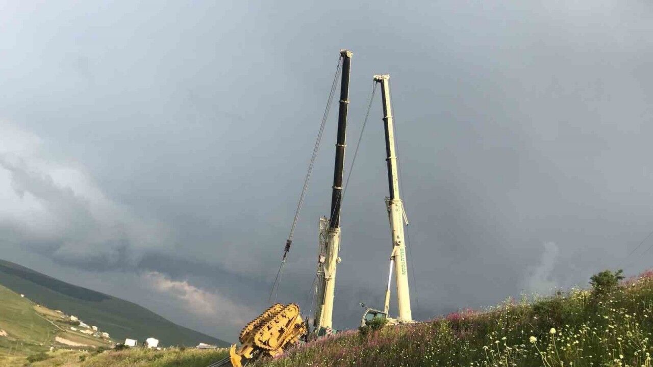 Jandarma trafik ekipleri tarafından trafiğe kapatılan karayolunda güvenlik önlemleri alındı. Ardından 2 vinç yardımıyla yaklaşık 2 saatlik bir çalışmanın sonucunda Tır dorsesi ve dozeri uçurumdan çıkarak sahibine teslim etti.