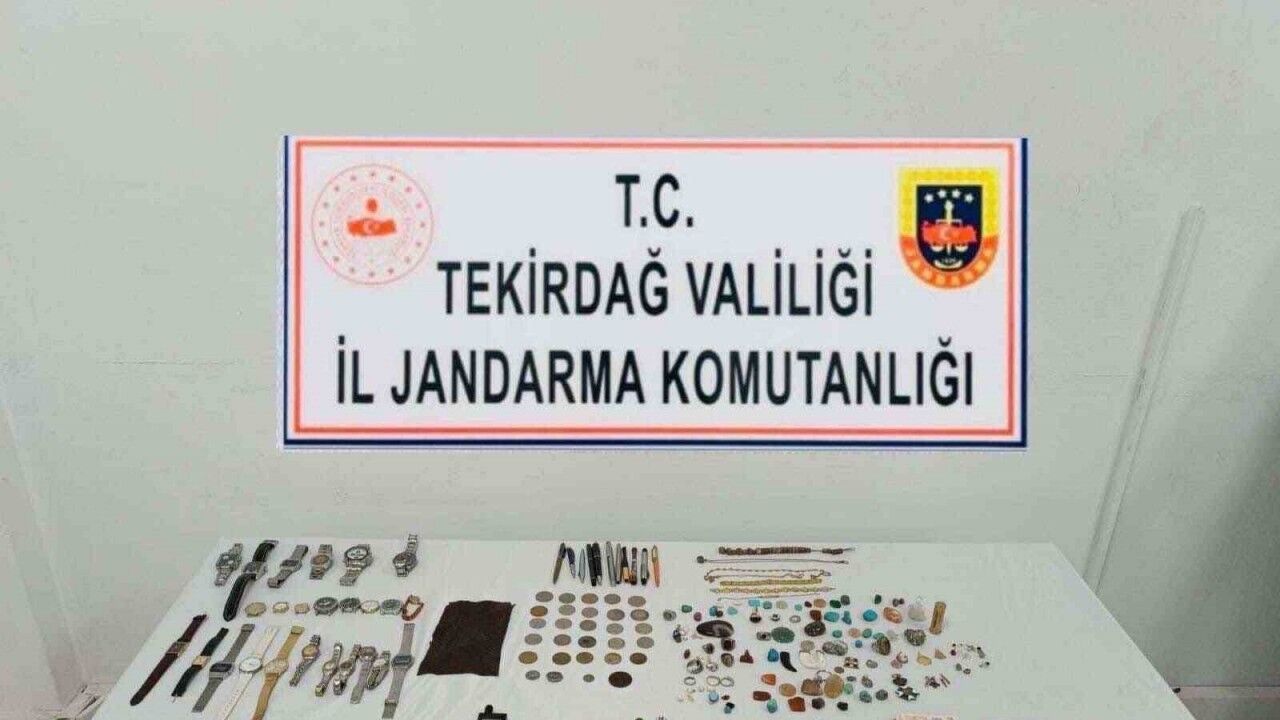 Tekirdağ İl Jandarma Komutanlığı ekiplerince Malkara ilçesi Haliç Mahallesinde durdurulan yabancı uyruklu M.M. isimli şahsın yaşa dışı yollardan ülkeye giriş yapmış olduğunun tespit edilmesi üzerine şahsın üzerinde ve eşyalarında arama yapıldı. Yapılan aramada, 1 adet değerli taş ölçüm cihazı, 119 adet taş ve obje, 29 adet eski para, 1 adet yılan derisi, 1 adet sahte kimlik, 6 adet kolye, 25 adet kol saati, 9 adet kalem, 10 bin 430 Euro nakit para ele geçirildi. Malzemelerinin yaklaşık piyasa değerinin 695 bin TL. olduğu öğrenildi. Şüpheli şahıs işlemlerin ardından adli makamlara sevk edilecek.