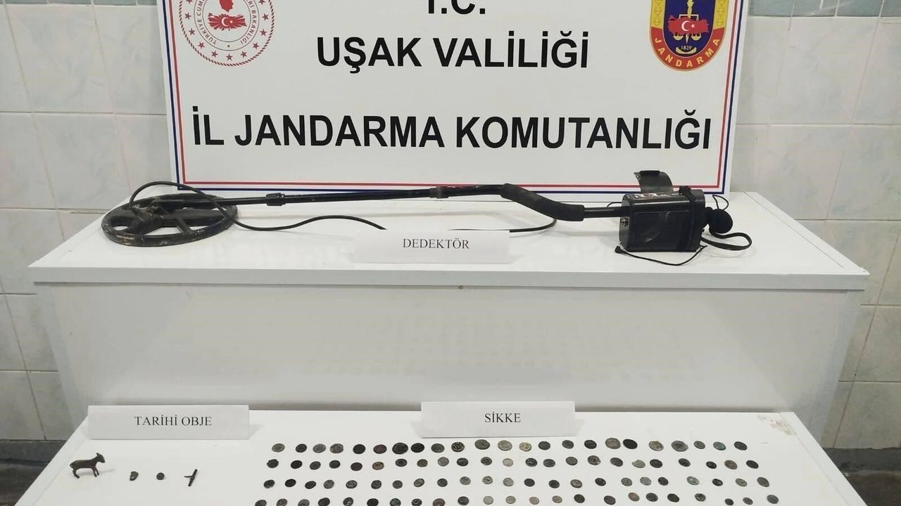 Uşak'ta jandarma ekiplerince düzenlenen operasyonda çok sayıda sikke ve tarihi obje ele geçirildi.