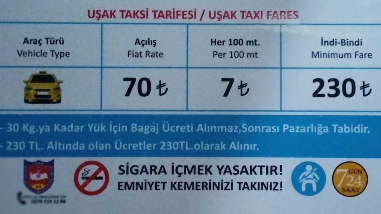 Uşak'ta da birçok ilde olduğu gibi taksi ücretlerine zam geldi. Uşak Şoförler ve Otomobilciler Esnaf Odasından yapılan açıklamada taksilerdeki yeni ücret tarifesi paylaşıldı. Uşak'ta 50 TL olan açılış ücreti 70 TL'ye yükseltildi. Kilometre başı 50 TL olan taksimetre fiyatı ise 20 TL zamlanarak 70 TL olurken, indi-bindi ücreti ise 170 TL'den yüzde 35,29 zamla 230 TL'ye yükseldi.