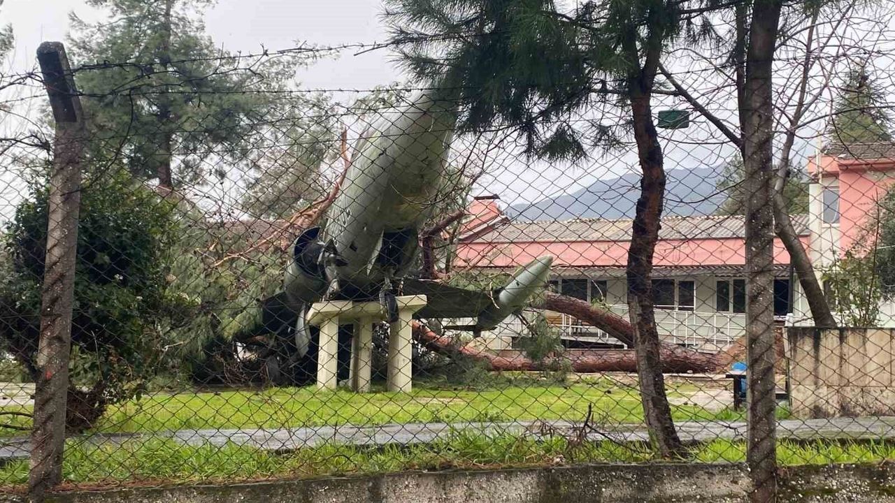 Denizli'de fırtınanın devirdiği çam ağacı, Uçaklı Okulun simgesi uçağın üzerine düştü. Kaidesinden kayan uçak zarar görürken, ortaya çıkan görüntü rüzgarın şiddetini gözler önüne serdi.