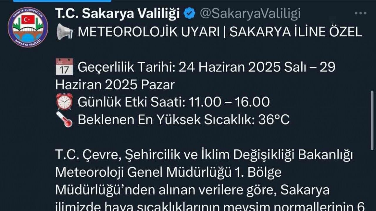 Meteoroloji Genel Müdürlüğü’nün verilerine göre Sakarya’da hava sıcaklıklarının önümüzdeki günlerde mevsim normallerinin 6 ila 9 derece üzerine çıkması bekleniyor. Bu gelişmenin ardından Sakarya Valiliği, özellikle 24-29 Haziran tarihleri arasında yaşanacak aşırı sıcaklara karşı vatandaşları 11.00-16.00 saatleri arasında dışarı çıkmamaları yönünde uyardı.