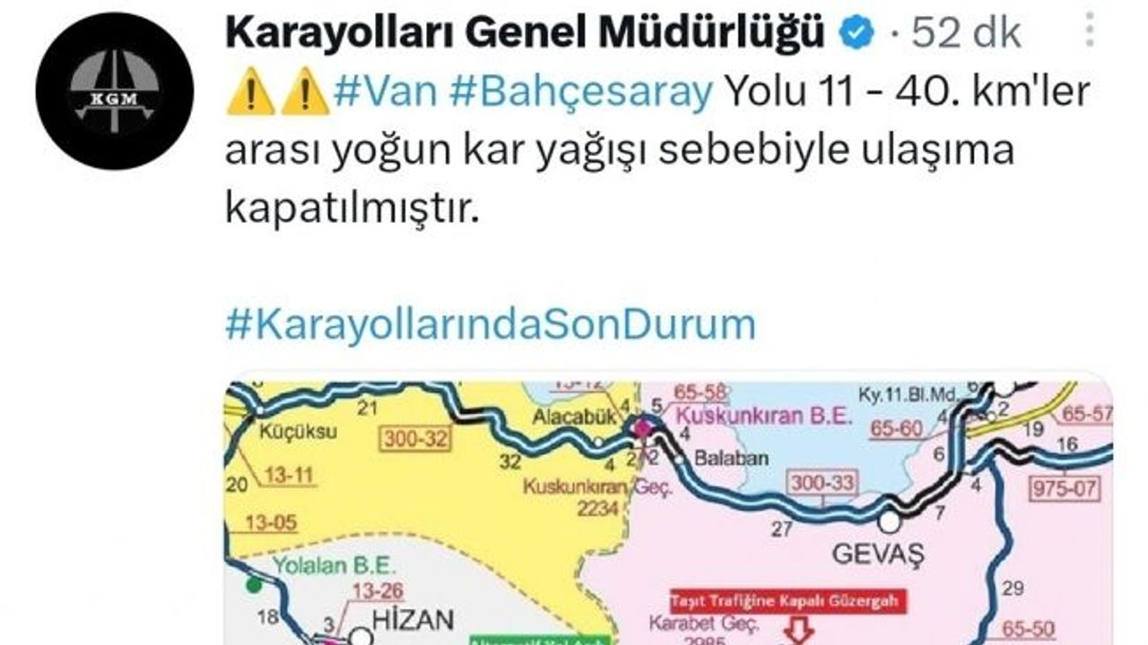 Van-Bahçesaray karayolu yoğun kar yağışı ve çığ tehlikesinden dolayı ulaşımda kapatıldı.